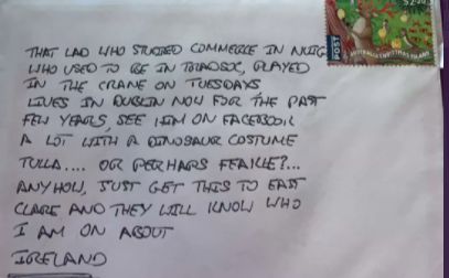 “”Gearoid, This was given to me in Tulla by the postman saying I might know who it’s for. I’m guessing its for you…”